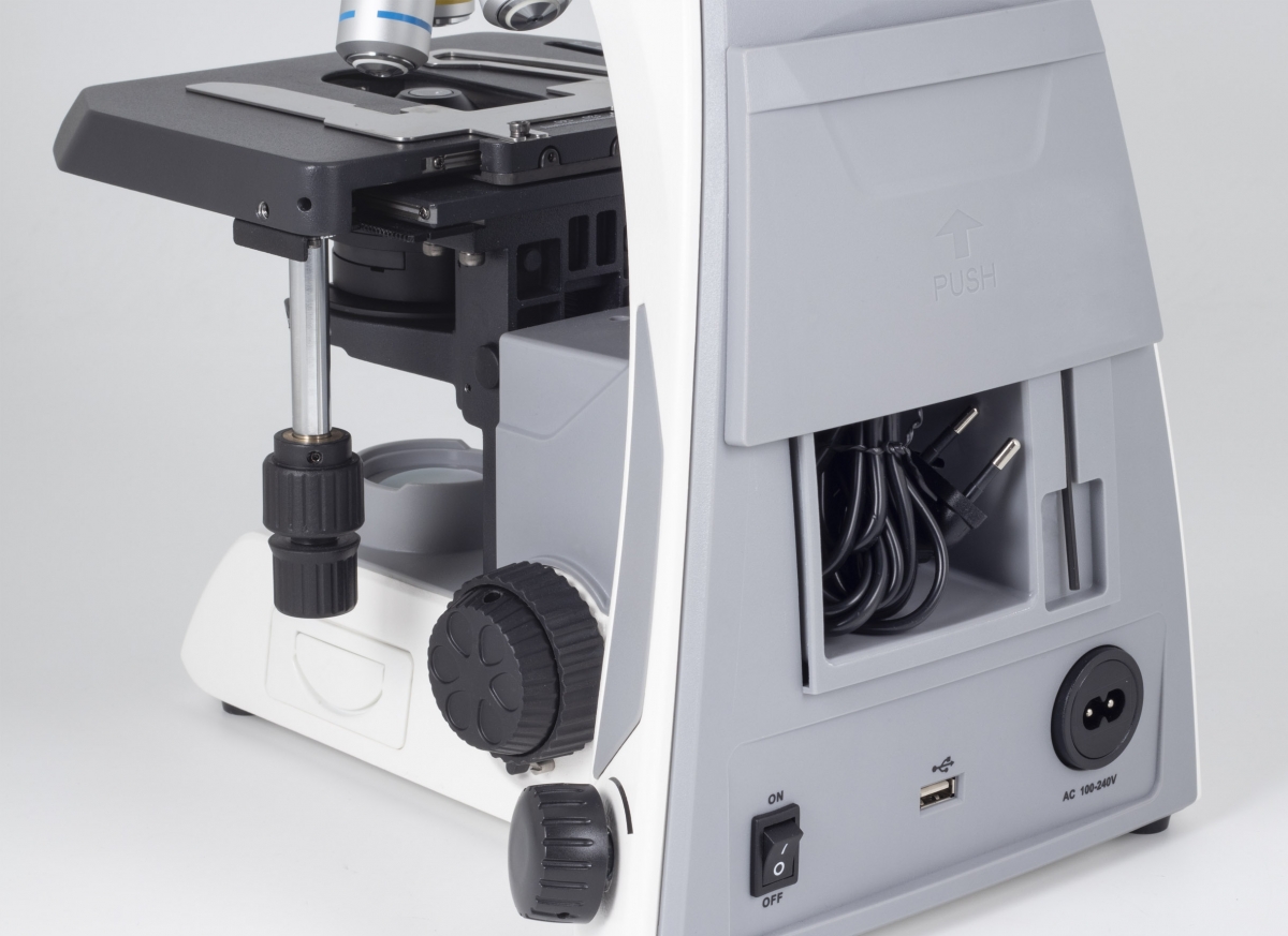 - Tête optique binoculaire ou trinoculaire (50/50) inclinée à 25° pivotante sur 360° pour faciliter le rangement