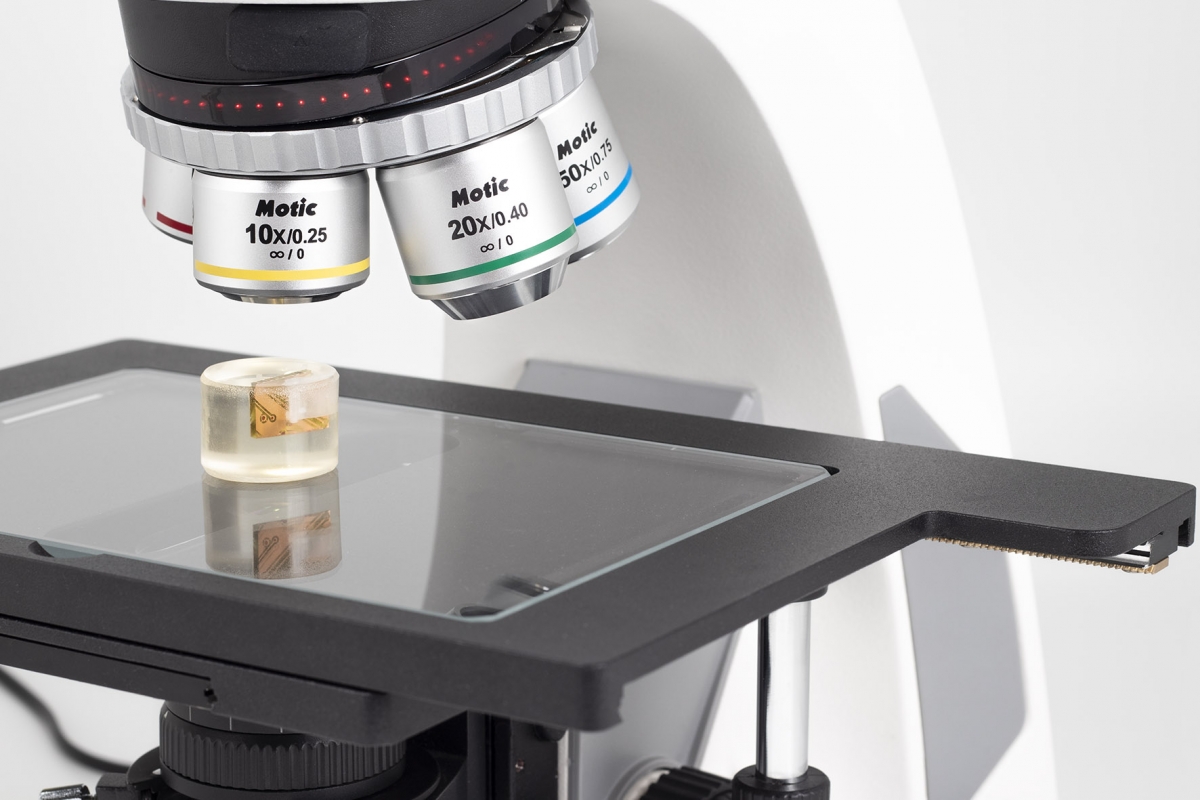 Microscope Panthera TEC MAT BD-T avec un condenseur équipé d'un système à 39 LEDs permettant un éclairage incident et la détection de défauts sur des matériaux plats et réfléchissants, sans avoir à bouger l’échantillon.