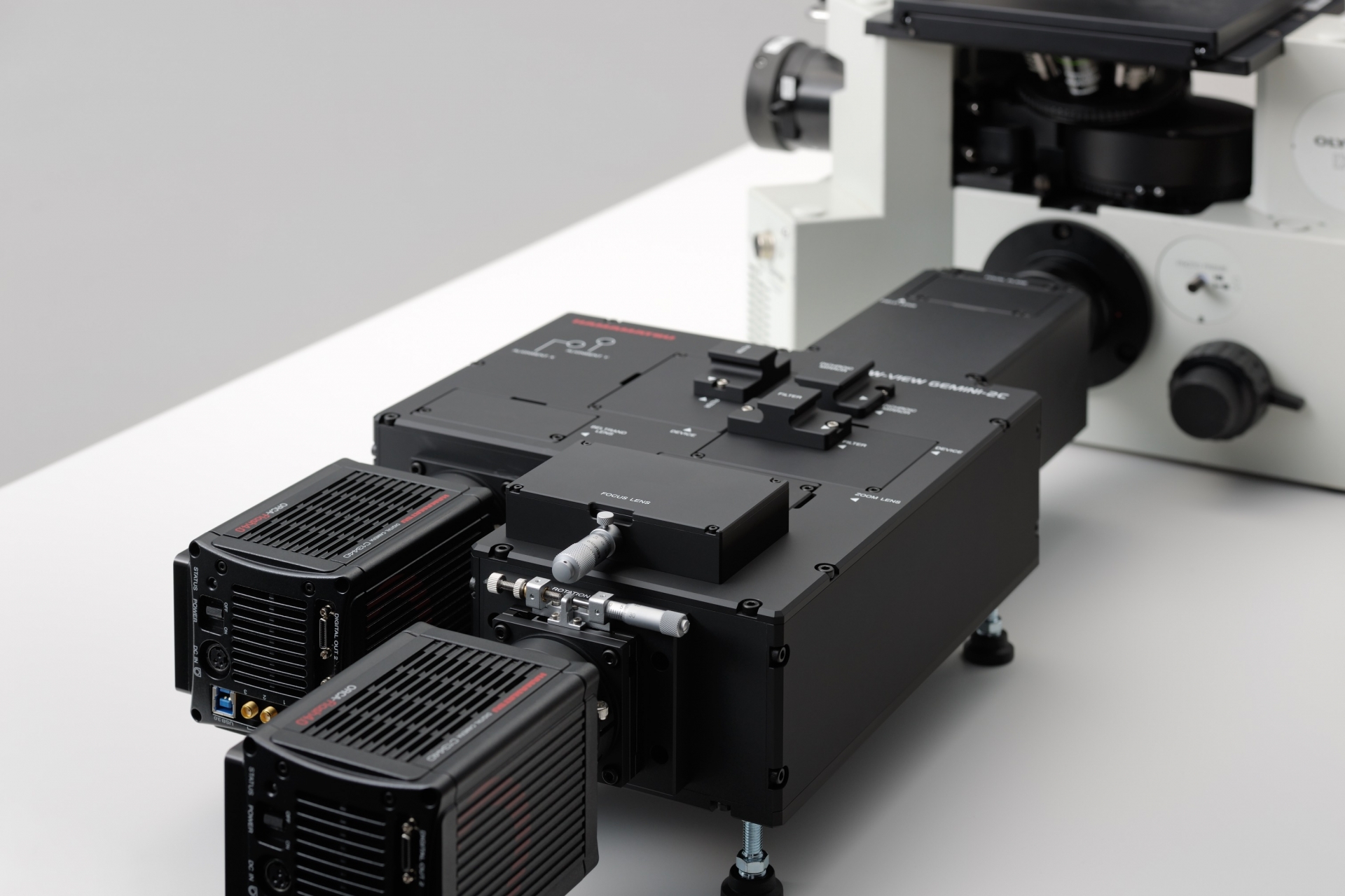 Conçus pour être stables sur les microscopes inversés et verticaux, les connecteurs à monture C du W-VIEW GEMINI sont placés le long d'un axe linéaire